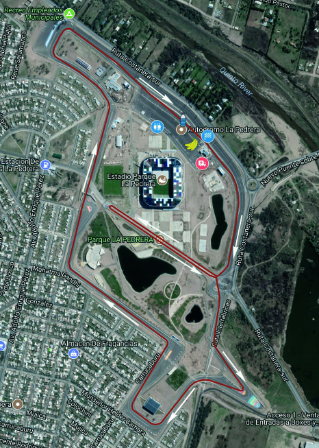La largada es frente a la torre por el carril de boxes. Se transitará en dirección a las agujas del reloj. Aproximadamente a los 600m del recorrido se deberé salir del circuito girando a la derecha para ingresar a un bulevar interno, al final (500m) se retoma por el otro carril del bulevar hasta ingresar nuevamente al circuito. Al llegar al circuito girar a la derecha y continuar hasta la recta principal. Ingresar por el carril de boxes hasta el arco de largada. Este recorrido tiene una longitud de 5075m. Se deberán dar dos vueltas para completar la competencia.